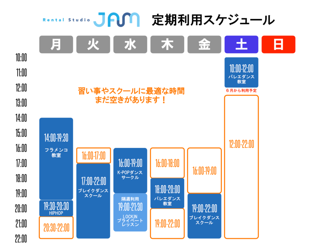 基本的にはこちらのスケジュールは埋まっておりますが、「5週目」や「祝日」は空いている場合がございます🙆‍♂️適時、空き情報をチェックしてスポットでのご利用も可能です✅